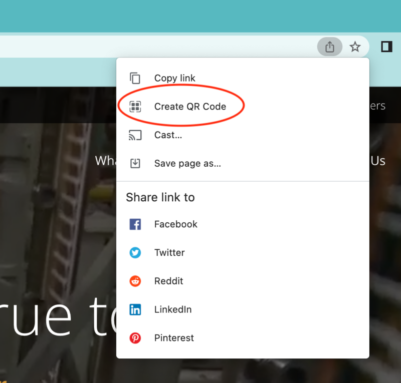 In the upper right-hand corner of your browser, click on the icon for “Share this page.” You’ll see a menu of options. Choose “Create QR code.”